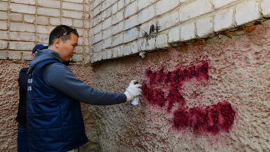 Нашақорлыққа жол жоқ! Жастар ұйымдарының белсенділері мен облыстық мәслихаттың депутаттары Ақтөбе қаласындағы тұрғын үйлердің қабырғасында нашақорлықты жарнамалаған граффитилердің үстінен бояу…