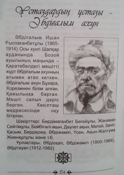 Әбдіғалым ишан Рысмағанбетұлы 1865-1914 жылдары Шалқар өңірінде өмір сүрген. Әбдіғалым ишан Бұхара, Хорезмде білім алған. Қажылыққа барған. Сол кезеңдегі кедергілерге қарамастан, Бегімбет пен Бозой елді мекендері арасында орналасқан Қаратөбел жерінде мешіт, медресе салып, жас буынға дәріс берген. Қазіргі таңда атамыз салған медресе сақталмағанмен, медресенің тұрған орны, қорымы бар.