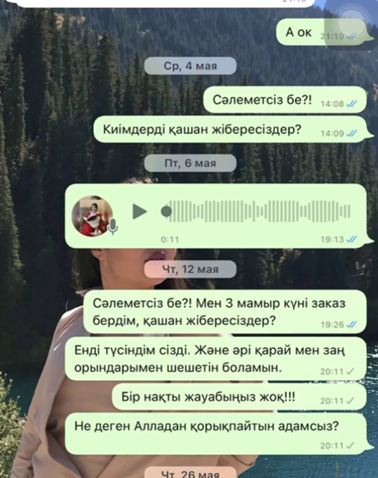 Тұтынушылар да киім сапасы туралы жағымды пікірлер жазған екен. Мен бұл интернет дүкеннен өз талғамыма келетін киімдерді таңдап, тапсырыс беремін деп шештім. Оған қоса жеңілдіктер науқанына тап болып, қуанышым еселене түсті. Жеңілдік акциясына сай «3 киім алсаң — 25 000 теңге, ал 4 киімге 38 мың теңге төлейсіз» деді. Содан әуелі сілтеме арқылы өтіп, WhatsApp арқылы жаздым, бірінші күні жауап қайтармады. Екінші күні жазғанымда жауап жазып, тек курьер қызметімен жұмыс жасайтындарын айтты. Сосын өзім таңдаған 4 киімнің суретін жібердім. «Тапсырыс орындау үшін төлем толық төленуі тиіс», — деді интернет дүкеннің саудагері. Мен сәл күдіктенген едім, ол өзінің жеке куәлігінің суретін жіберіп, ақшаны теңгерім ретінде жіберуімді сұрады. Осы кезде бұл төлемде бір шикілік бар екендігін сездім. Біле тұра 38 мың теңгені телефон нөміріне теңгерім арқылы аударып жібердім. Бір апта өткен соң хабарласқан едім, жауап бермеді. Алданғанымды сонда түсіндім, — деді қала тұрғыны Аяжан Әбдіқалық.