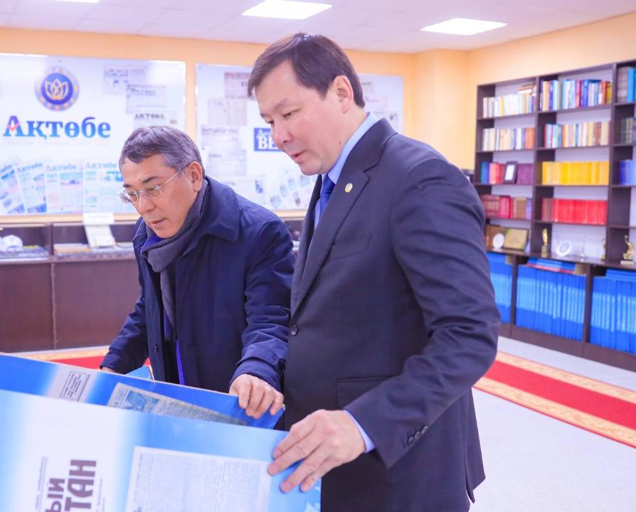 Облыс әкімі алдымен «Ақтөбе Медиа» ЖШС қарасты облыстық «Ақтөбе» және «Актюбинский вестник» газеттері, сондай-ақ «Үштаған» журналының нөмірлері мен жәдігерлері жинақталған мұражай-кітапхананы аралап, ұжыммен кездесті.