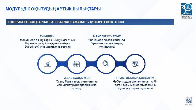 — Модульдік оқыту — негізгі жұмыстан қол үзбей білімі мен білігін арттырғысы келетін азаматтарға арналған әдіс. Оқу бағдарламасы 6 модульден тұрады. Әрбір модульде офлайн және қашықтан оқыту форматтары қарастырылған. Мұндай тәсіл білім алушыларға оқу материалдарын арнайы кесте бойынша ыңғайлы түрде игеруге мүмкіндік береді, — деді ол.
