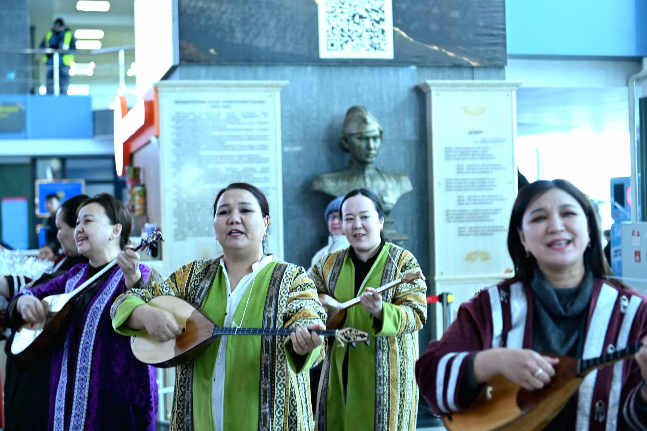 Жиналғандар әншілермен бірге қосыла ән шырқап, көпшілікке таныс әуендерге би биледі. Тіпті рейстің келуін күтіп отырған жолаушылар өнерпаздардың өнерін ұялы телефонына түсіріп, жақындарына таратып та үлгеріп жатты.