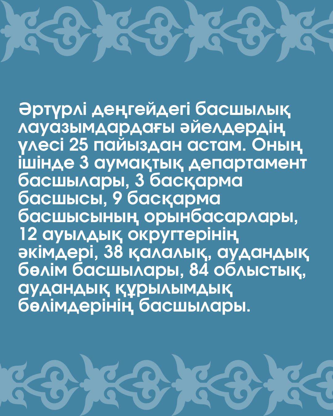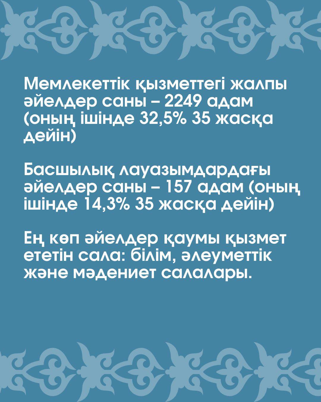 Әртүрлі деңгейдегі басшылық лауазымдардағы әйелдердің үлесі 25 пайыздан астам. Оның ішінде 3 аумақтық департамент басшылары, 3 басқарма басшысы, 9 басқарма басшысының орынбасарлары, 12 ауылдық округтерінің әкімдері, 38 қалалық, аудандық бөлім басшылары, 84 облыстық, аудандық құрылымдық бөлімдерінің басшылары.