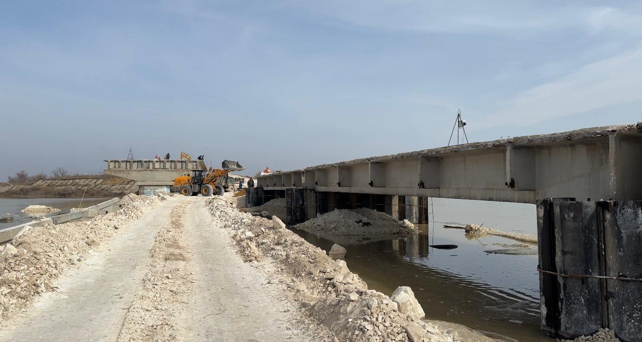 Құрылыс учаскесінде 25 бірлік арнайы техника және 75-ке жуық адам жұмыс істеуде. Құрылысшылар алдымен тіректерді орнатып, содан кейін жолдың плиталарын төсейді. Жауапты мекеме алдағы екі-үш күнде көпір құрылысын аяқтап, тапсыруды жоспарлап отыр. Сондай-ақ, ол арқылы өтетін қозғалыс та қалпына келтіріледі. Дегенмен, мердігер мекеме өкілдері өңір басшысының сынына ілікті.