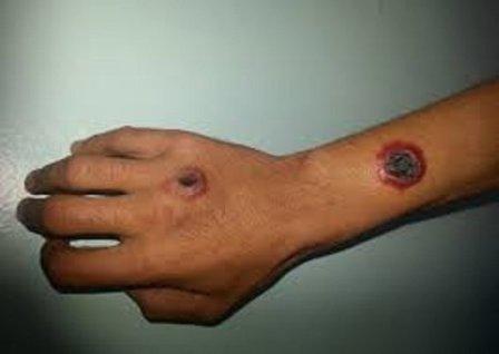 Ауру 95-97% жағдайда жергілікті (теріде) түрде өтіп, терідегі инфекцияның түскен жерінде қызыл дақтың пайда болуымен жедел басталады, дақ пустулаға, кейін қара қабықшамен қапталған айналасы қызарған жараға айналады. Дене қызуы бірінші күннің соңында 39-40ºС-ге дейін көтеріліп, 5-7 күн сақталады.
