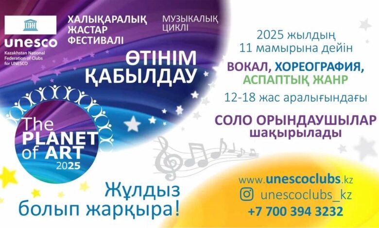 Қазақстандық Ұлттық ЮНЕСКО клубтарының Федерациясы THE PLANET OF ART – 2025 Халықаралық жастар фестивалінің музыкалық циклінің басталғанын хабарлайды.
