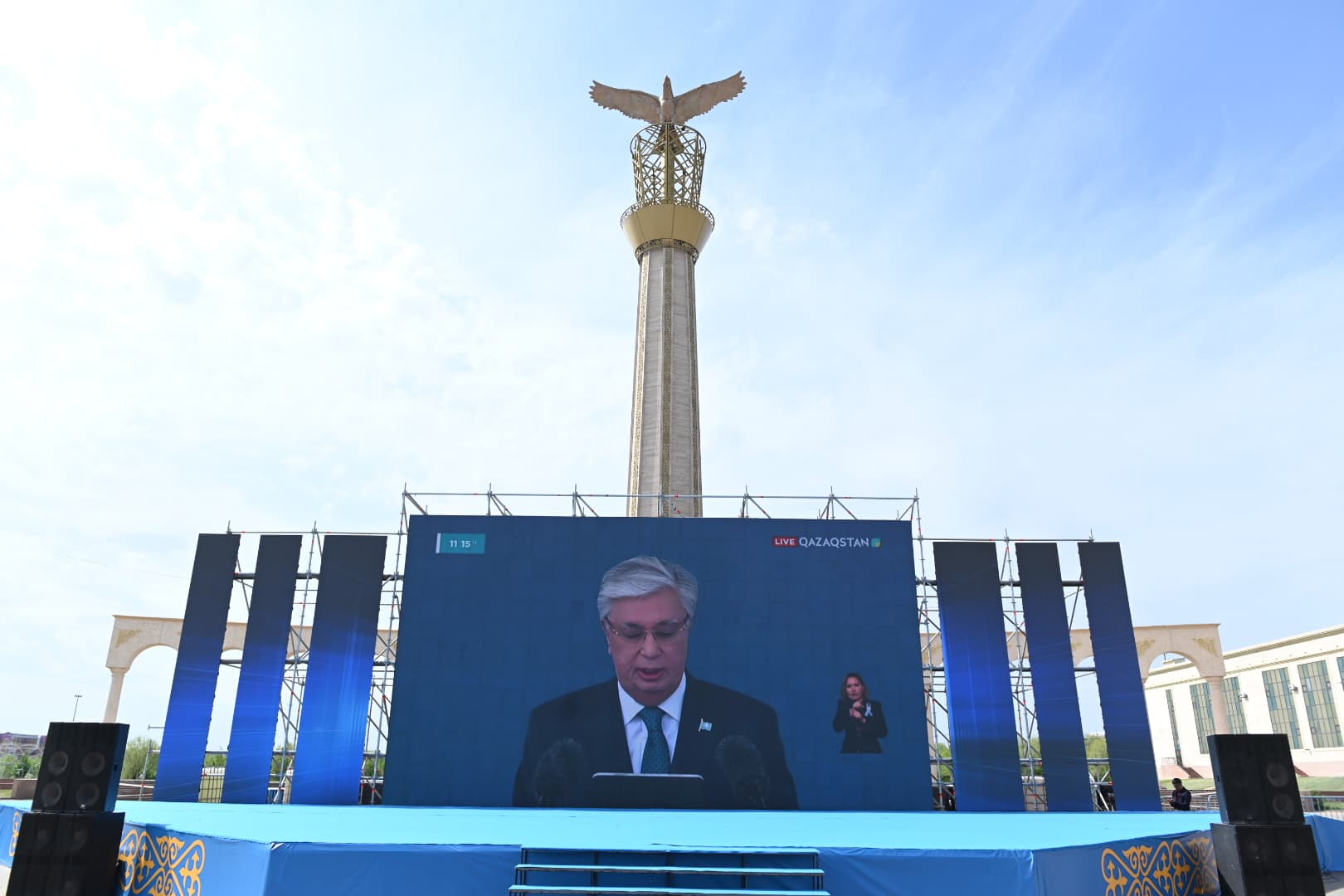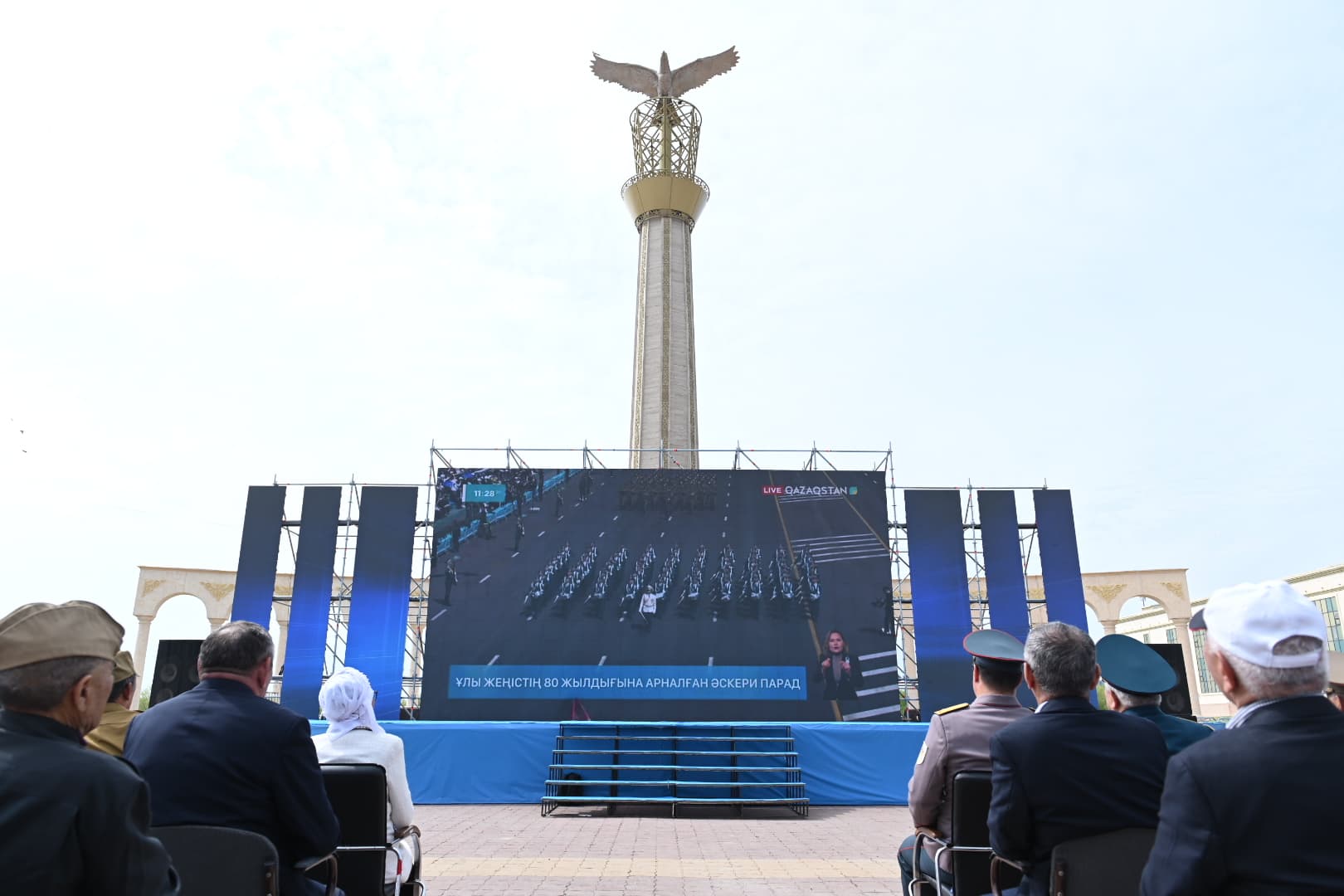 «Қазақ халқына мың алғыс» стеласы алаңында орнатылған үлкен экраннан қала тұрғындары мен қонақтары мерекелік шеруді тамашалады.