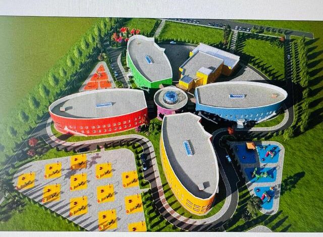 Құрылыс ел Президентінің тапсырмасы бойынша «Заңсыз иемденілген активтерді мемлекетке қайтару туралы» Заң аясында қайтарылған қаражат есебінен бой тіктеп жатыр. Мердігер мекеме— «Казстройподряд» ЖШС. Балабақша ғимараты ерекше архитектуралық шешіммен жобаланған. Нысан гүл пішініндегі орталық және 5 екі қабатты блоктан тұрады. Әр блок орталық атриуммен өткелдер арқылы байланысады. Орталық блокта қысқы бақ пен кіреберіс вестибюль орналаспақ. Ал №1 блокта тірек-қимыл аппараты бұзылған, №2 блокта көру қабілеті бұзылған, №3 блокта есту және сөйлеу қабілеті бұзылған және №4 блокта зияткерлік дамуында ауытқуы бар балаларға қызмет көрсетіледі, №5 блокта ортақ пайдалануға арналған үй-жайлар (медициналық бөлім, изолятор, акт залы, бассейн, әкімшілік және асхана бөлімі) және №6 блокта атриуммен табиғи жарық түсетін вестибюль, зал және консерватория болады.