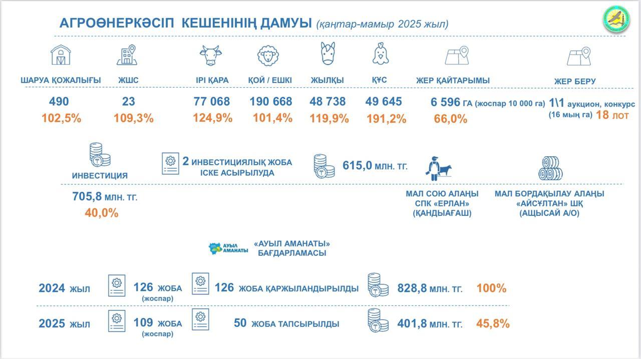 Аудан әкімі Дархан Ермағанбетов өз баяндамасында бес айды қорытындылап, өнеркәсіпте өсім артып, инвестициялық белсенділік күшейіп келе жатқанын жеткізді. Агроөнеркәсіптік кешеннің дамуы қарқынды, инфрақұрылымдық жобалар да жүйелі түрде жүзеге асырылуда.