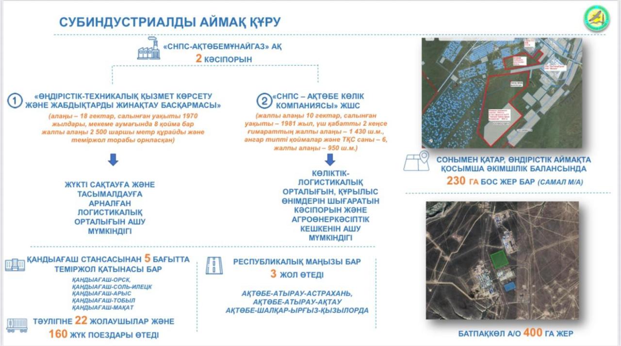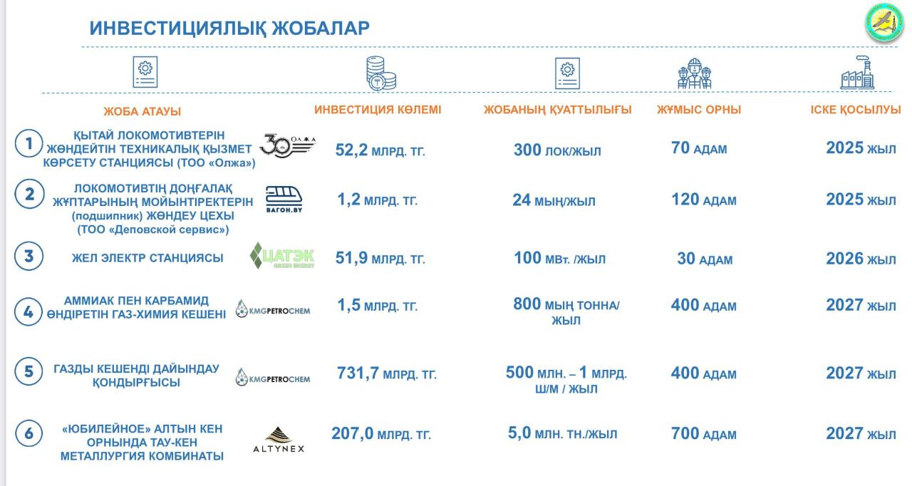 «Біз инвестицияларды тартуға және ауқымды жобаларды іске қосуға ерекше назар аударамыз. Ауданда Қытай локомотивтеріне техникалық қызмет көрсету бекеті салынуда және келешекте жел электр станциясы, газ-химия кешені, Тау-кен металлургия комбинатының құрылысы жоспарланып отыр. «СНПС-Ақтөбемұнайгаз» базасында логистикалық әлеуеті бар субиндустриалды аймақ құрылуда. Осы жобалардың іске қосылуы бизнестің дамуына мүмкіндік беріп, жаңа жұмыс орындары ашылады», – деп атап өтті Дархан Ермағанбетов.