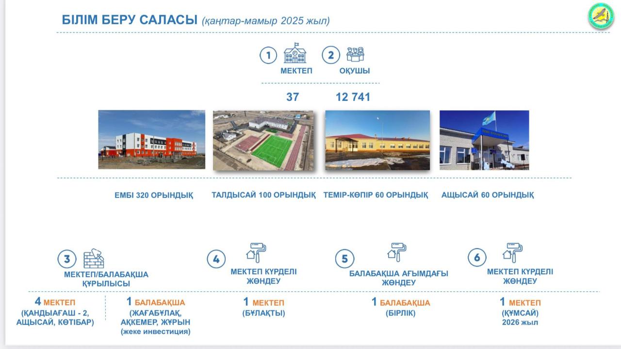 Әлеуметтік инфрақұрылым саласында мектептер, балабақшалар мен спорт нысандарын салу және жөндеу белсенді түрде жалғасып жатыр. Ауданда 12 741 оқушы білім алып жүрген 37 мектеп бар. Ембі, Талдысай, Темір-көпір, Ащысай ауылдарында жаңа мектептер салынды. Сонымен қатар, Қандыағаш және Көтібар ауылында екі білім ордасы, Жағабұлақ, Ақкемер және Жұрында балабақшалар бой көтеруде.