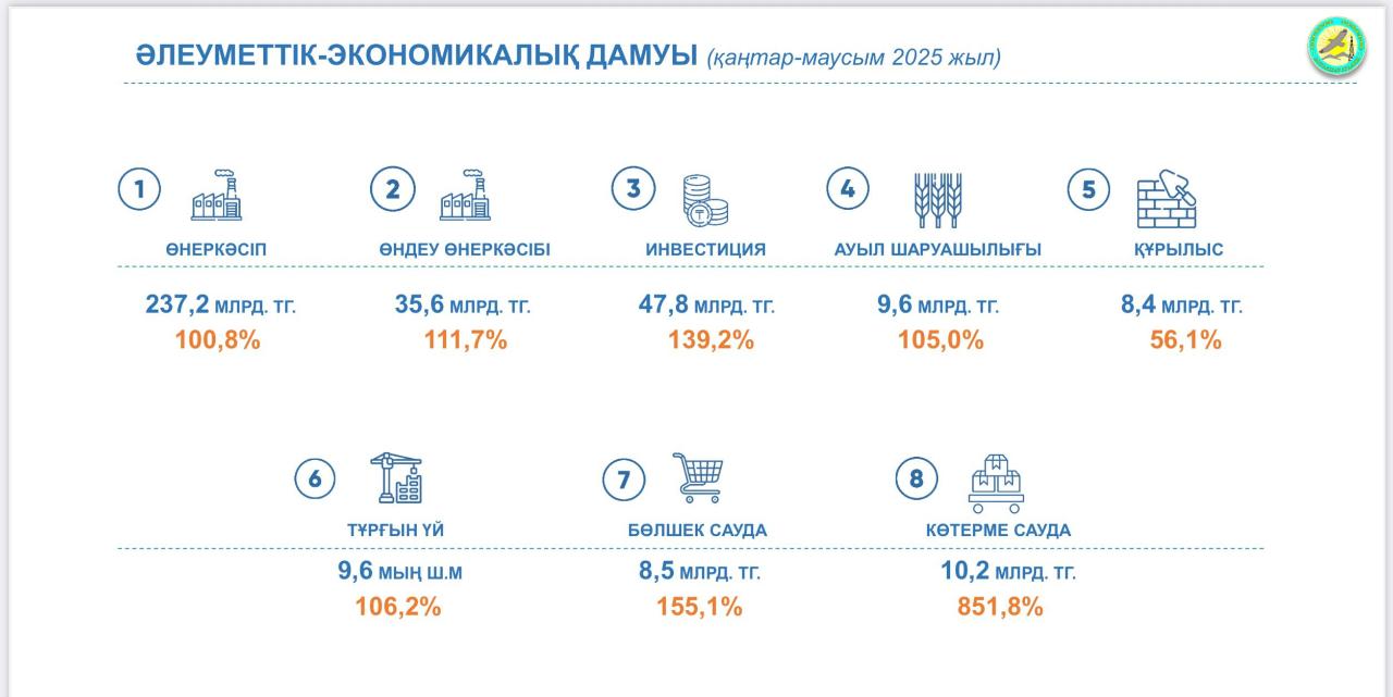 Жыл басынан бері ауданда 9,6 мың шаршы метр тұрғын үй пайдалануға берілді, бұл былтырғы деңгейден 6,2%-ке жоғары. Орындалған құрылыс жұмыстарының көлемі 8,4 млрд теңгеге жетті. Сауда-саттықта да өсім бар: бөлшек сауда айналымы 55%-ке, көтерме сауда айналымы 8 есе өсті.
