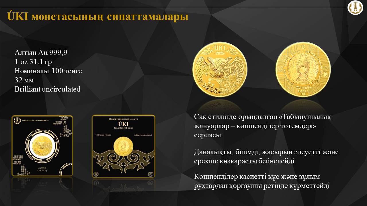 ÚKI физикалық монетасы алтынның 999,9 ең жоғары үлгісіндежасалған,салмағы 31,1 грамм (бір троя унциясы) және номиналы 100 теңге. Монета арнайы қорғаныс қаптамасында (блистерде) келеді ал оның дизайны даналықты, білімді, жасырын әлеуетті және ерекше көзқарасты бейнелейтін «Көшпенділер тотемі – Жануарлар» сериясынан Сақ стилінде жасалған. Инвестициялық құндылықтан басқа, монета мәдени және эстетикалық қызығушылық тудырады.