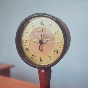 Біздің шаңырағымызда үстелде тұрған сағаттың бетінде мынадай жазу бар: «Делегатам акынов Челкарского района в знак уважения от акынов Иргиза. 10.09.1977 г.». Кеңестік дәуірдің қасаң қағидасымен мәтін бірыңғай орыс тілінде, ал аудан атауы сол тұстағы тәртіппен «Челкарского» деп берілген.