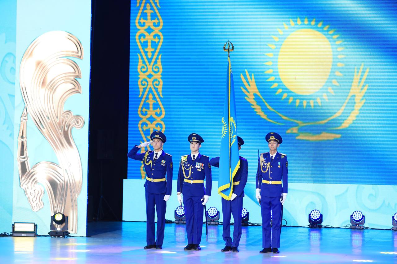 Ұлттың қасиетті мерекесі — Ата Заң күніне арналған кеш мемлекеттігіміздің символдары — Қазақстан Республикасының Мемлекеттік Туы салтанатпен әкелінуінен және Әнұранмен басталды.