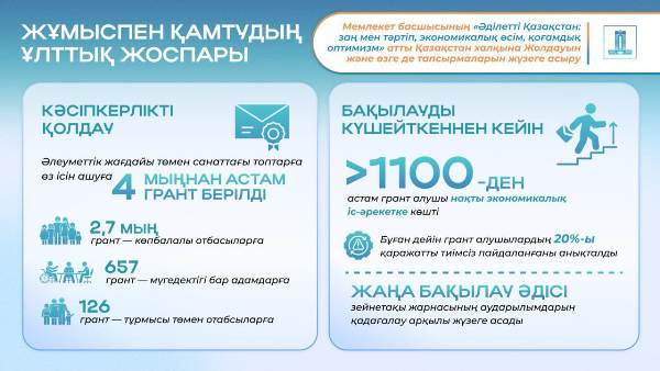 Мемлекет кәсіпкерлікті дамытуға бөлінетін гранттарды пайдалану тиімділігіне бақылауды күшейтуде. Өткен жылғы талдау көрсеткендей, 20% жағдайда қаражат тиімсіз пайдаланылды. Бағдарлама аясында жыл басынан бері әлеуметтік осал санаттағы азаматтарға 4 мыңнан астам грант берілді.