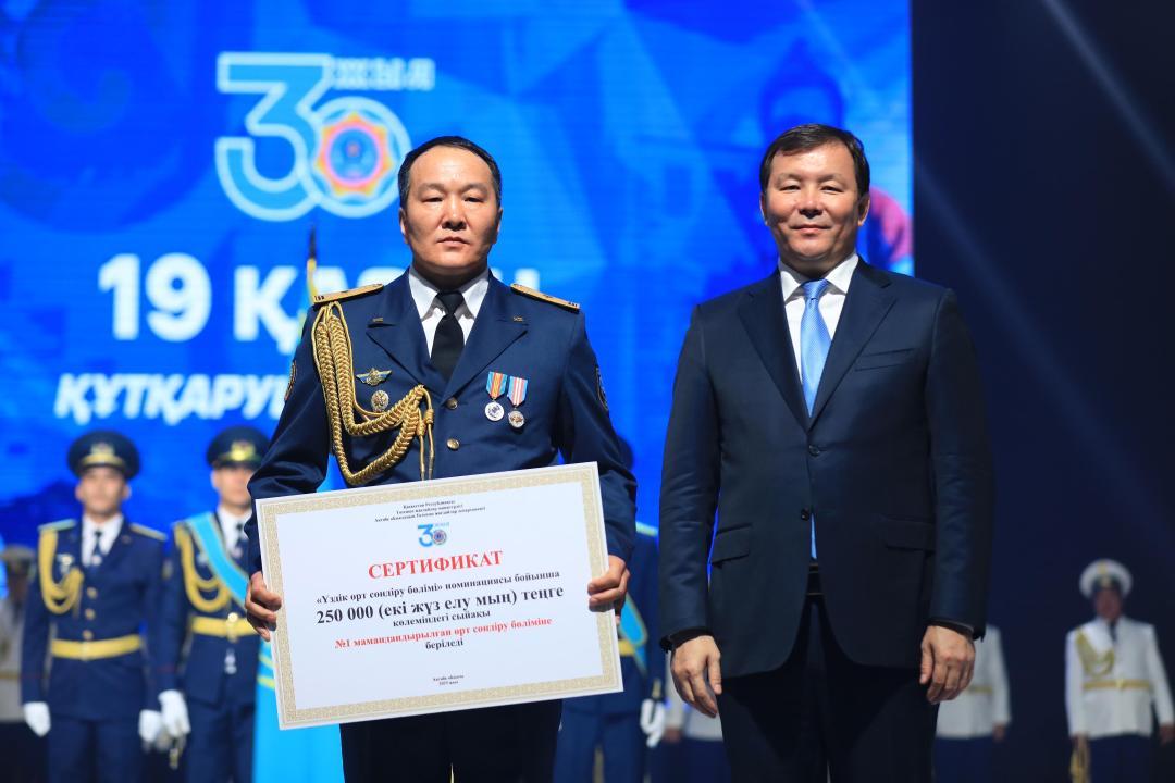 Мерекелік іс-шарада төтенше жағдайлар қызметінің үздік мамандары марапатқа ие болды. ҚР Төтенше жағдайлар министрінің бұйрығымен бірқатар қызметкерге арнайы шендермен төсбелгілер табысталды. Атап айтқанда, кезекші өрт сөндіру қызметінің жедел кезекшісі Нұржан Жарлағановқа – «Азаматтық қорғау полковнигі», №4 бөлімнің қарауыл бастығы Балтабек Қуанышбайға – «Азаматтық қорғау капитаны», Жедел-құтқару жасағының бас құтқарушысы Есентұрар Серғазыұлына – «Құтқарушы» төсбелгісі тағылды.