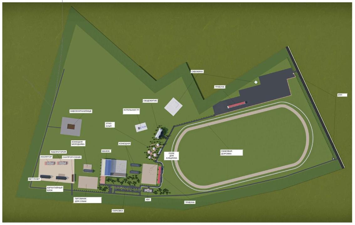 Институттың жобалық сызбасына сәйкес, кешен аумағында манеж, ат қора, ветеринариялық пункт, зертханалар мен ат жарыс жолы бар.