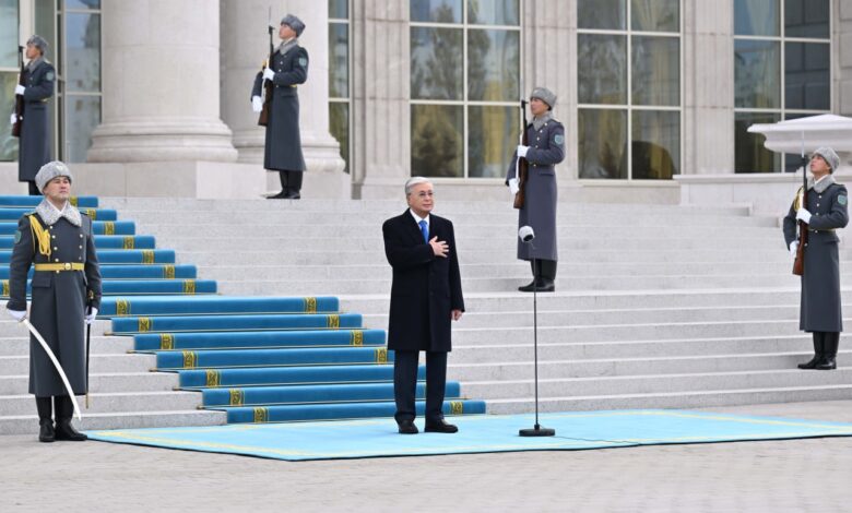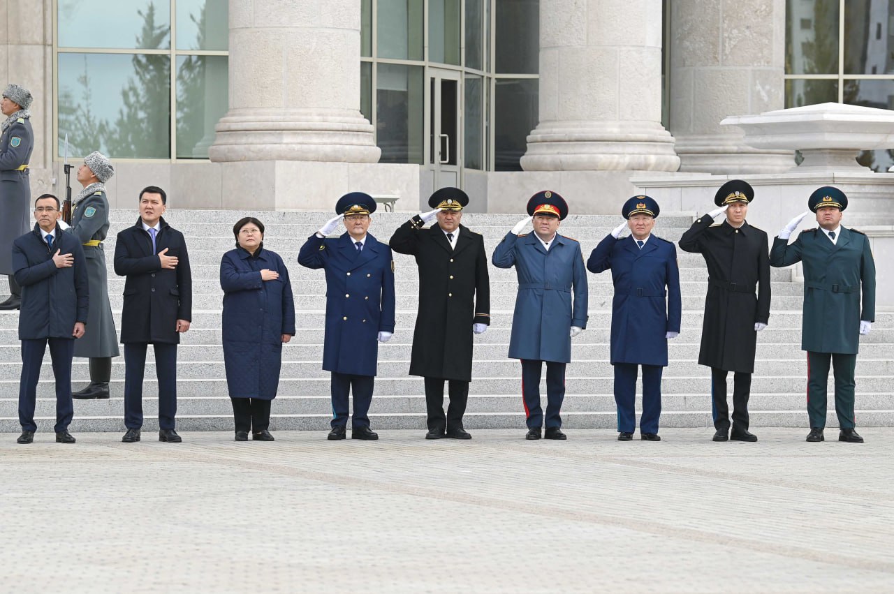 Құрмет қарауылының бастығы Президентке рапорт берді. Содан кейін еліміздің Мемлекеттік туы көтеріліп, әнұраны орындалды.