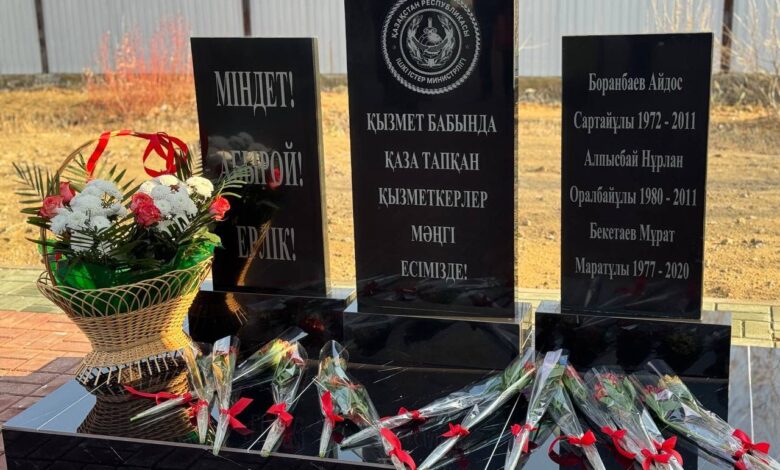 «Міндет! Абырой! Ерлік! Қызмет бабында қаза тапқан қызметкерлер — мәңгі есімізде! Айдос Боранбаев, Нұрлан Алпысбай, Мұрат Бекетаев». Қара граниттен құйылған ескерткішке осылай жазылып, марқұмдардың туған-мерт болған жылдары көрсетіліпті.