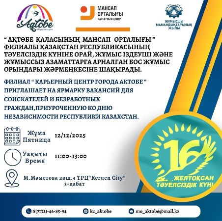 2025 жылдың 12 желтоқсан күні сағат 11:00 – 13:00 аралығында «Ақтөбе облысының жұмыспен қамтуды үйлестіру және әлеуметтік бағдарламалар басқармасы” ММ-сі және Ақтөбе қаласының мансап орталығы Қазақстан Республикасының Тәуелсіздік күніне орай, жұмыс іздеуші және жұмыссыз азаматтарға арналған бос жұмыс орындары жәрмеңкесіне шақырады.