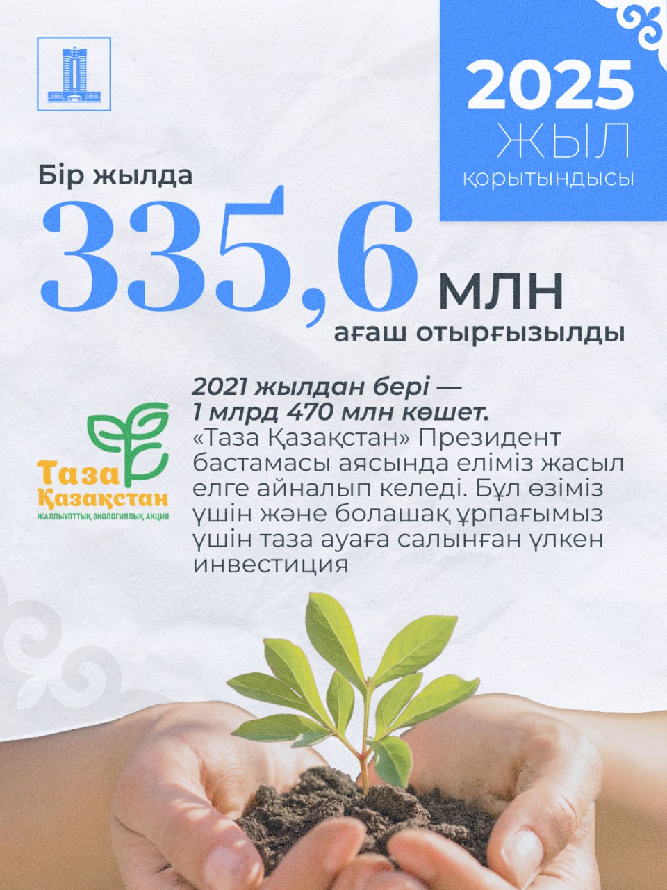 2021 жылдан бері – 1 млрд 470 млн көшет. «Таза Қазақстан» Президент бастамасы аясында еліміз жасыл елге айналып келеді. Бұл өзіміз үшін және болашақ ұрпағымыз үшін таза ауаға салынған үлкен инвестиция.