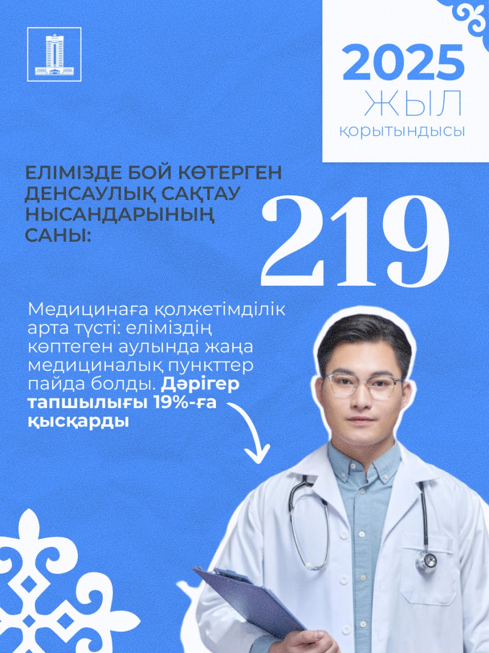 Медицинаға қолжетімділік арта түсті: еліміздің көптеген аулында жаңа медициналық пункттер пайда болды. Дәрігер тапшылығы 19%-ға қысқарды.
