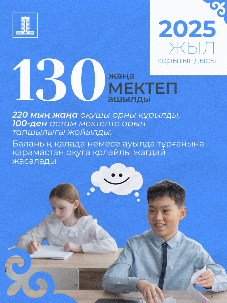 220 мың жаңа оқушы орны құрылды, 100-ден астам мектепте орын тапшылығы жойылды. Баланың қалада немесе ауылда тұрғанына қарамастан оқуға қолайлы жағдай жасалады.