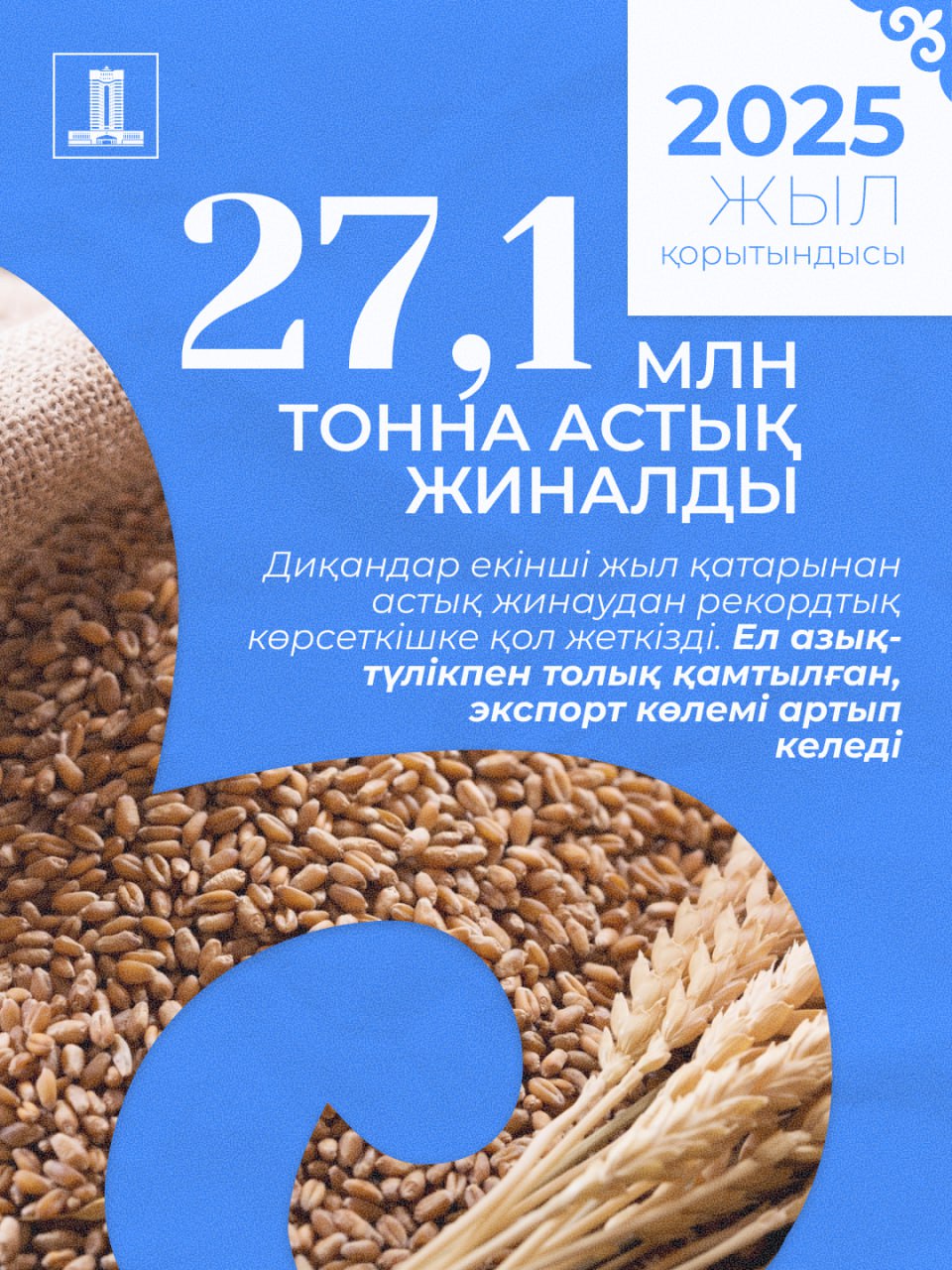Диқандар екінші жыл қатарынан астық жинаудан рекордтық көрсеткішке қол жеткізді. Ел азық-түлікпен толық қамтылған, экспорт көлемі артып келеді.