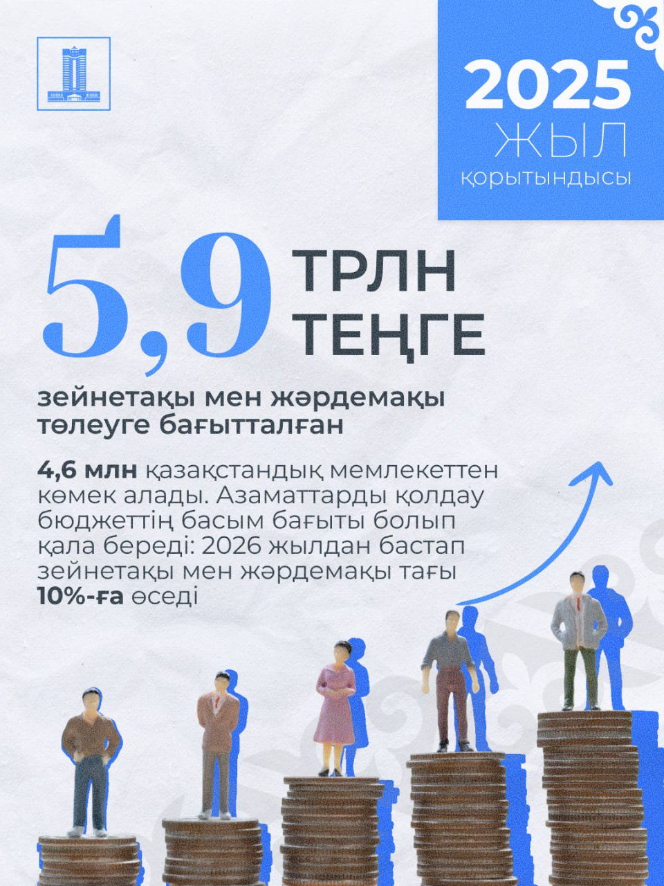 4,6 млн қазақстандық мемлекеттен көмек алады. Азаматтарды қолдау бюджеттің басым бағыты болып қала береді: 2026 жылдан бастап зейнетақы мен жәрдемақы тағы 10%-ға өседі.