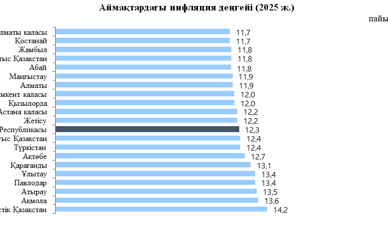 Өңірлер арасында жылдық инфляцияның төмен деңгейі Алматы қаласы мен Қостанай облысында – 11,7%, сондай-ақ Абай, Жамбыл және Батыс Қазақстан облыстарында байқалды – 11,8% деңгейінде.