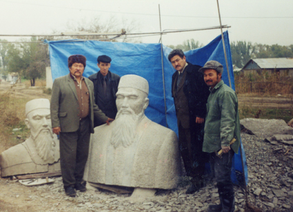 Суретте: Далалықтағы Құрақбайдың қосының есігінің алдында. Мөңке бидің кеуде мүсіні, мүсінші Құрақбай және Мөңке бидің жетінші ұрпағы Бердібай Кемал.