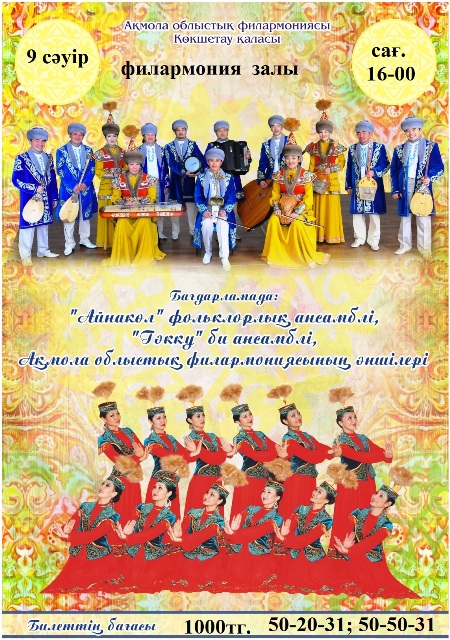 Бүгін Ғ.Жұбанова атындағы облыстық филармонияда сағат 16.00-де Ақмола облыстық филармониясының «Айнакөл» фольклорлық және «Гәкку» би ансамбльдерінің, жеке солистерінің концерті болады.