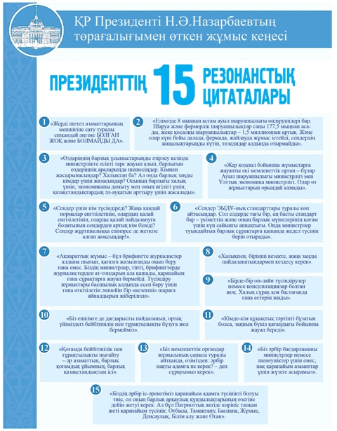 Ең бастысы, Елбасымыз елді мазасыздандырған мәселелерге қатысты нақты жауап берді, басшылардың қоғамға жақын болуын, ел-жұртпен етене араласуын тапсырды. Мен осыған қуандым. Жеріміз елдің игілігіне, халықтың пайдасына жарап жатса, ал азаматтарымыз сырттай бақылаушы болып қоймай, өздері сол жерді игеруге белсенділік танытса, артық әңгіме туындамайтынына сенімдімін.