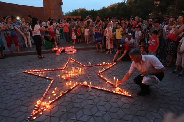 Кештің ең әдемі де әсерлі тұсы — бес жұлдыз бейнесі мен «75» санын майшаммен жазу болды. Сол күні аспан да халықпен бірге мұңайғандай түнеріп тұрды. Бейбіт тұрғындардың тілегі «Жойылсын жалғыз сөз соғыс деген…» әнімен үндесіп жатты.