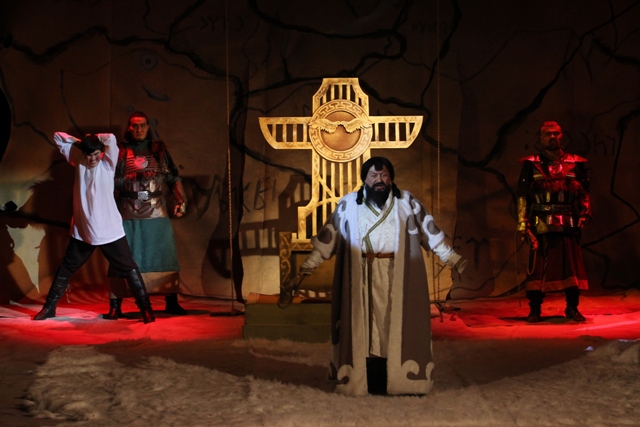 Т.Ахтанов театрының артистері спектакльді өз мүмкіндіктерінің шеңберінде алып шықты. Шыңғыс хан рөлінде Т.Ахтанов театрының ақсақалы, республикаға танымал актер Мағзом Бақытжанов, оның нөкері Қаһарды Есет Оразалин, Көріпкел әйелді ҚР мәдениет саласының үздігі, актриса Майгүл Мұзбаева, Гүрбелжіңді Әсел Құсайынова, тұтқын рөлін Нұрсұлтан Айтқалиевтар сомдады. Сахнаға алғаш рет Гүрбелжің сияқты жетекші рөлді әдемі алып шыққан жас актриса Әсел Құсайынованың аяқалысы көрермендер тарапынан қолдау тапты.