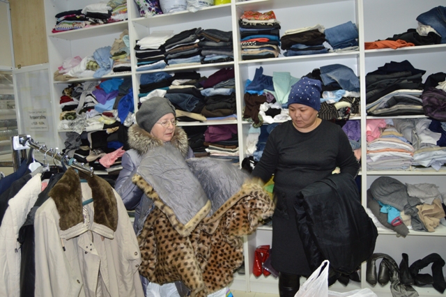«Алтай» сауда үйіндегі Игі істер дүкеніне бас сұққанымызда, үлкен сөмкелермен жүк әкеліп жатқан зейнеткерді кездестірдік. Өзін Людмила деп таныстырған ол (суретте) осымен екінші рет келіп тұр екен. Бұл жолы қысқы тонын, күртесін табыстауға келген әжей: