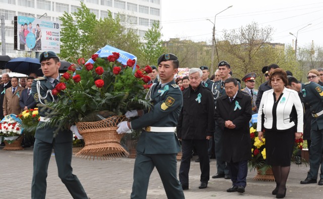 Салтанатты рәсімге жиналғандар соғыста қаза тапқандарды бір минут үнсіздікпен еске алды. Содан кейін облыс әкімі Бердібек Сапарбаев бастаған топ «Мәңгілік алау» және Кеңес Одағының Батыры Әлия Молдағұлованың мемориалды ескерткіштерінің басына гүл шоқтарын қойды. Меймандар «Батырлар аллеясын» аралап көрді.