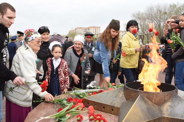 Жеңіс күні облыс әкімі Бердібек Сапарбаев, облыстық мәслихаттың хатшысы Сәния Қалдығұлова, қазақтан шыққан тұңғыш Олимпиада чемпионы Жақсылық Үшкемпіров бастаған топ «Мәңгілік алау» ескерткіші алаңына барды. Бұл жерге соғыс және еңбек ардагерлері мен әскерилер, сондай-ақ қала тұрғындары көптеп жиналды. Олардың әрқайсысы еркіндікті қорғап, ұрпақтарына бейбіт күн сыйлаған Отан қорғаушыларға бас иіп, құрмет көрсетуге келді.