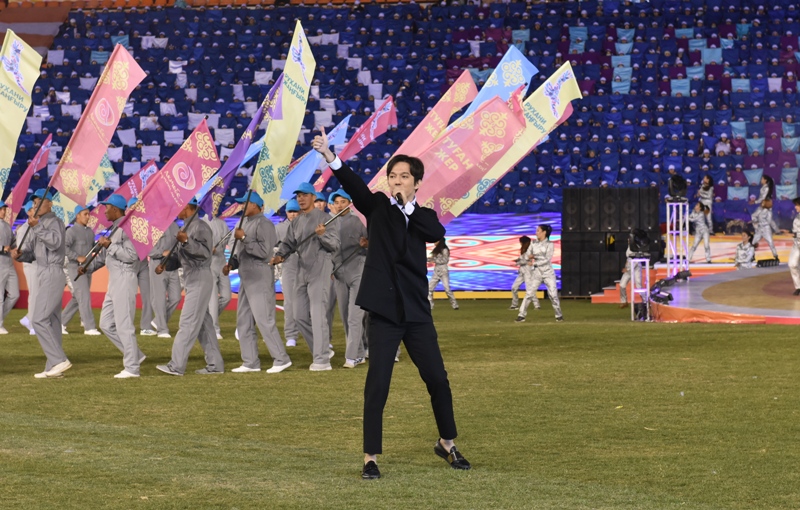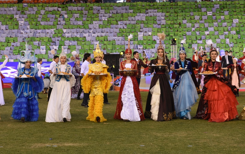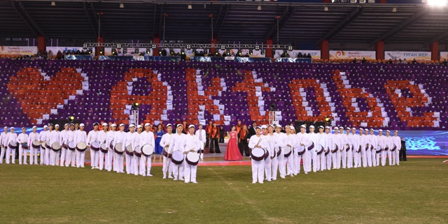 Бұл күні стадион іші халыққа лық толды. Салтанатты мерекелік шарада форум қонақтары арнайы жайылған кілемнің үстімен өтіп, құрметті орынға жайғасты. Бұл кезде стадионның орталық алаңында мектеп оқушылары мен студенттер қолдарына түрлі түсті планшеттер ұстап, әртүрлі көркемдік бейнелерді көпшілік назарына ұсынды. Патриоттық рухтағы әуеннің ырғағымен «Рухани жаңғыру», «Туған жер», «Қазақстан», «Астана», «Ақтөбе» сынды композициялық жазулар, сол сияқты қыран құсты бейнелеген көріністер көз қуантып, көңілді шаттандырады. Әрине, бір-ақ сәтте көрсетіліп өтетін мұндай көріністерді көрермен назарына тартымды етіп ұсыну үшін мектеп оқушылары мен студенттердің біраз тер төгіп, бірнеше күн дайындықтан өткені, ең бастысы — бұл жұмыстардың артында көптеген өнер ұжымдарының үлкен еңбегі жатқаны белгілі.