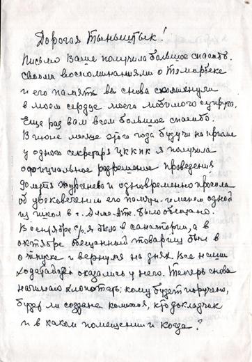 Осы таныстықтан кейін апаймен хат жазысып, Алматыға жолым түскенде, міндетті түрде үйіне соғып, үзбей хабарласып тұрдық. Апайдың хаттарын қымбат дүниедей сақтап жүрмін. Ырғыздағы алғашқы кездесуден кейін жазған хатында: «…1986 жылы сіздерге, Темірбектің отанына барып қайтқаным қандай жақсы болды. Сол сапарыма аса ризамын. Бір кездері бала Темірбектің табаны тиген топырақты басқаныма қуандым, оның жерлестері мен алыс туыстары боп келетін алтын адамдармен танысқаныма қуандым. Осы күнге дейін сіңлімнің сырқатына алаңдап, сіздерге алғыс айтып, арнайы хат жібере алмаған едім. Темірбектің отанында мені жылы қарсы алып, құрметтегендеріңіз үшін ризашылығымды білдіремін. Сіздердің бастамаларыңыз бойынша жасалып, орнатылған аяулы жарымның ескерткішіне бас идім, оның атындағы көшеде болдым, музейді көрдім. Жүргеновтің ескерткіші ашылған күнді ұмыту мүмкін емес… Жиналған жұрттың жүзіндегі мақтаныш пен айтылған ақжарма естеліктер менің жүрегімдегі құпия сандықта мәңгілік сақталған сол бір күнгі Темірбектің өшпес бейнесін қайта тірілтті. Көзіме жас келді», — депті.
