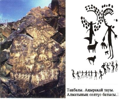 — Алматының солтүстік-батысында, 170 шақырымдай қашықта орналасқан Аңырақай жотасындағы Таңбалыда сақталған суретті қалпына келтіргенде, біз Наурыз мерекесінің тарихи куәлігін немесе тарихи төлқұжатын тапқандай болдық. Суретке мен былайша түсінік беремін: онда жербетілік мақұлықтардан әлдеқайда ірі екі тұлға бейнеленіпті: оң жағындағы күндидарлы адамкейіпті тұлға «Тәңір» аталып жүрген жарқын күш болса керек, оның сол жағында әрі қарап, түндидарлы сайтанкейіпті Ыңыр (Іңір — қазақта күн батқаннан кейінгі кеш түскен уақытты білдіретін ұғым түрінде қалған) тұр. Олардың ортасында сағат тіліне қарсы бағыт бойынша сиыр жылының төрт маусымы бейнеленген: жаңа туған бұзау, одан жоғары — жайылып жүрген ала баспақ, ал оның сол жағында семіз де мүйізі қарағайдай ірі бұқа Тәңірге қарап тұр да, оның астында мүйізі түскен, ауру да көтерем сиыр тәлтіректеп тұр. Бұл — сәйкес түрде бейнеленген жылдың төрт мезгілі — көктем, жаз, күз және қыс. Олардан төмен түрлі айуан бейнесіндегі он екі адам билеп жүр. Бұлар — жылдың он екі айы. Бұл сурет — ежелгі Наурыз мерекесінің рәсімі, яғни сиыр жылының Наурызын мейрамдау көрінісі!